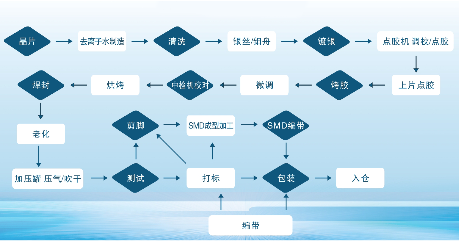 9、测试包装:对成品进行电性能指标测试,剔除不良品,保证产品质量。